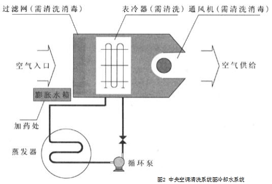 空氣調節系統是不容忽視的關鍵部位見圖245冷凝器系統的清洗范圍冷凝器系統的清洗范圍包括冷卻水系統冷凝器冷卻塔及相關水管道冷凍水系統蒸發器風機盤管/表冷器水側及相關管道循環風系統過濾器風機盤管/表冷器風側。