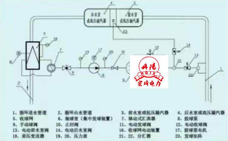 熱水進入循環水出水管道。發球過程中,膠球從集中發球裝置集中發送→循環水進水管道→凝汽器水室入口→凝汽器水室出口→收球網+集中發球裝置。可增設后水室發球點。