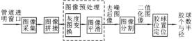 本文軟件模塊的任務就是從一周期的連續圖像中自動檢測出所有膠球的數量及磨損程度。其軟件檢測框圖如圖3所示。先通過工業攝像機采集膠球連續圖像,并根據時間順序存儲;然后利用圖像拼接算法去除每兩幅連續圖像之間的重復部分,再進行灰度變換、圖像平滑等一系列預處理過程去噪,去噪后采用基于小誤差分割法的灰度圖二值化變換對圖像進行分割,得到目標明確的分割圖像;后,在此基礎上,進行膠球位置定位,獲得膠球的數量及磨損狀況。
